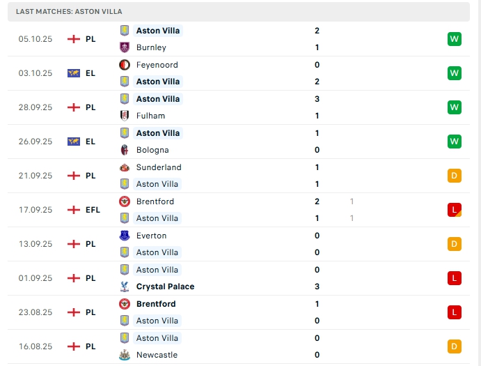 - Phong độ Aston Villa