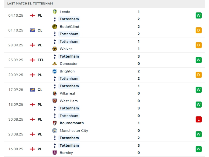 Tottenham ở 7 vòng đấu đầu tiên, họ mang về 4 chiến thắng,2 hòa và 1 thất bại, họ có được 14 điểm và đang xếp vị trí 3 trên BXH, ở trận gần nhất Tottenham có chiến thắng 2-1 trước Leeds, trận thắng này nối dài chuỗi bất bại lên đến con số 7 với 4 chiến thắng và 3 hòa, phong độ thời gian qua của Tottenham là ấn tượng, trên sân nhà Tottenham cũng đang chơi tốt với 3 chiến thắng, hòa 1 và thua 1 ở 5 trận gần nhất.