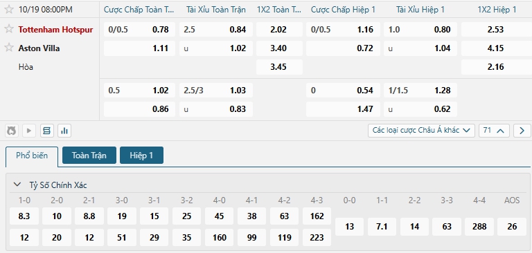 Bảng tỷ lệ kèo bóng đá trận đấu Tottenham vs Aston Villa