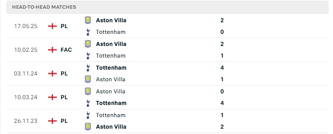 Phong độ gần đây Tottenham vs Aston Villa