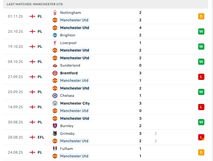 Man Utd ở 10 lượt trận đầu tiên đội bóng này có được 17 bàn thắng cùng hàng thủ nhận 16 bàn thua, hàng công đang dần chơi ổn dù vậy hàng thủ vẫn khá lỏng lẻo, 4/5 trận vừa qua của Qủy đỏ khép lại trên 3 bàn thắng, khi thi đấu xa nhà ở cả 5 trận gần nhất cả 5 trận đều vượt mốc trên 3 bàn.