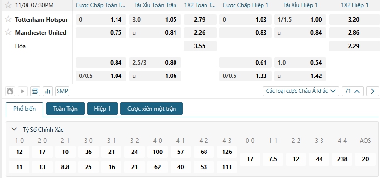 Bảng tỷ lệ kèo bóng đá trận đấu Tottenham vs Man Utd