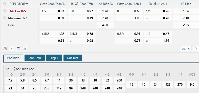 Bảng tỷ lệ kèo bóng đá trận đấu U22 Thái Lan vs U22 Malaysia