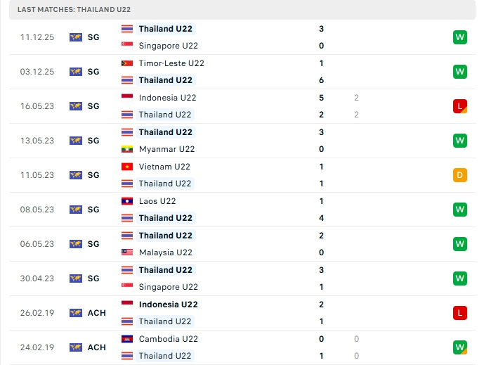 Phong độ gần đây U22 Thái Lan vs U22 Malaysia