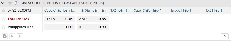 Bảng tỷ lệ kèo bóng đá trận đấu U23 Thái Lan vs U23 Philippines