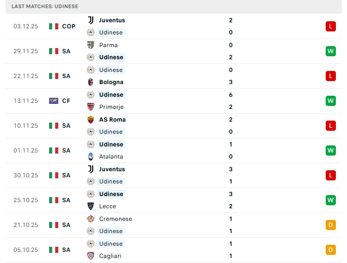 - Phong độ Udinese