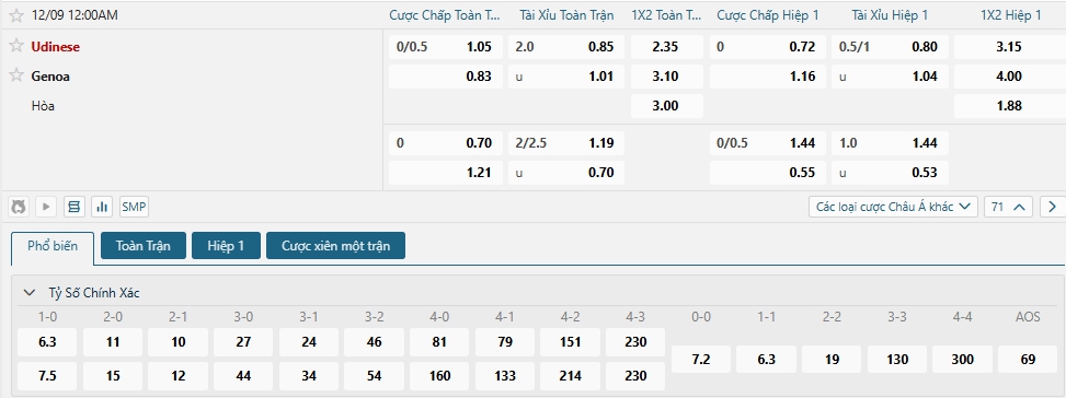 Bảng tỷ lệ kèo bóng đá trận đấu Udinese vs Genoa