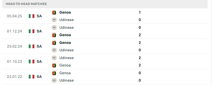 Những màn đụng độ giữa Udinese và Genoa thường diễn ra chặt chẻ với ít bàn thắng, 4/5 lần gặp nhau gần nhất của hai đội và 3/5 lần đón tiếp Genoa trên sân của Udinese khép lại không quá 2 lần lưới rung.