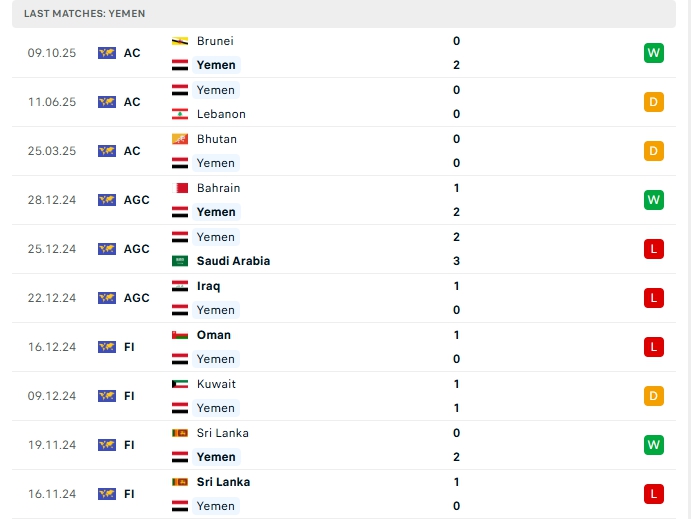 Yemen sau 3 lượt trận họ có được 1 chiến thắng cùng 2 hòa, có được 5 điểm và đang xếp thứ 2 của bảng B, ở ngày ra quân họ có trận hòa trước Brutan, sau đó cầm hòa trước Lebanon và mới nhất là chiến thắng ấn tượng 2-0 trước Brunei, phong độ thời gian qua của Yemen là khá tốt với 2 chiến thắng, 2 hòa ở 4 trận gần nhất.